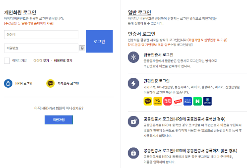 공동인증서, 금융인증서를 등록하거나 카카오톡/네이버 등 간편 인증 로그인 방식을 선택할 수 있습니다.